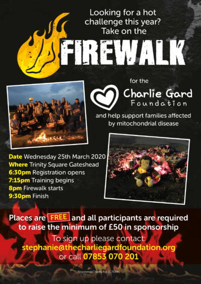 On Wednesday 25th March we’ll be tackling the firewalk in the courtyard of Trinity Gardens in Gateshead. Places are completely free but we do ask participants to raise the minimum of £50 in sponsorship. However, if you just fancy having a go at the firewalk for your own personal enjoyment, then we do have a set amount of places available at £20.